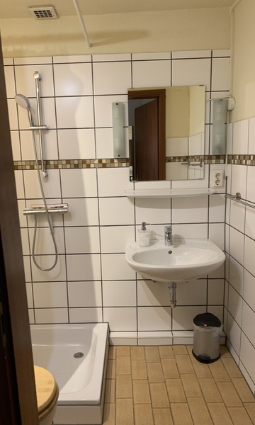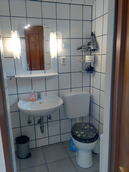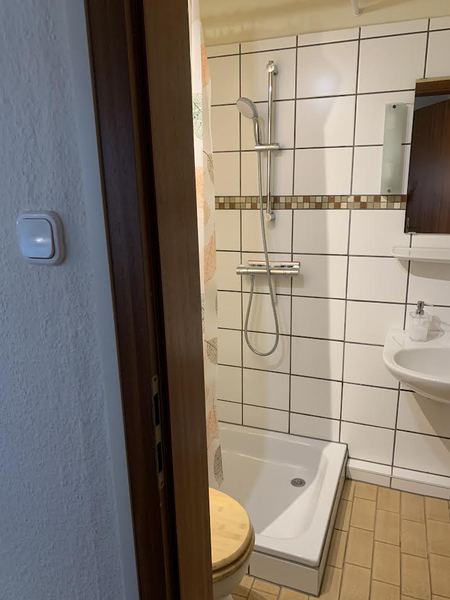 Im Erdgeschoss befindet sich das ca. 18 qm große Zimmer. Es ist für maximal zwei Personen eingerichtet und hat zwei Betten mit den Maßen 0,80 m x 2,00 m. Diese sind mit Kopfkissen und Bettdecken bestückt. Bettwäsche und Handtücher können gerne mitgebracht werden oder wie auf der Preisliste ersichtlich dazu bestellt werden. Ein Kleidergestell und Plastikboxen stehen zum Aufbewahren der Bekleidung zur Verfügung. Weiterhin ist ein SAT TV mit integriertem DVD – Player und ein Radio mit Anschluss für Bluetooth und Handy (über Kabel) im Raum. Die Küche ist mit einem Kühlschrank inkl. 3 *** Gefrierfach, zwei Herdplatten, Toaster, einer Mikrowelle und Kücheninventar ausgestattet. Der Fußboden ist mit einem Holzparkettboden ausgelegt. Ein Duschbad ist vorhanden.
